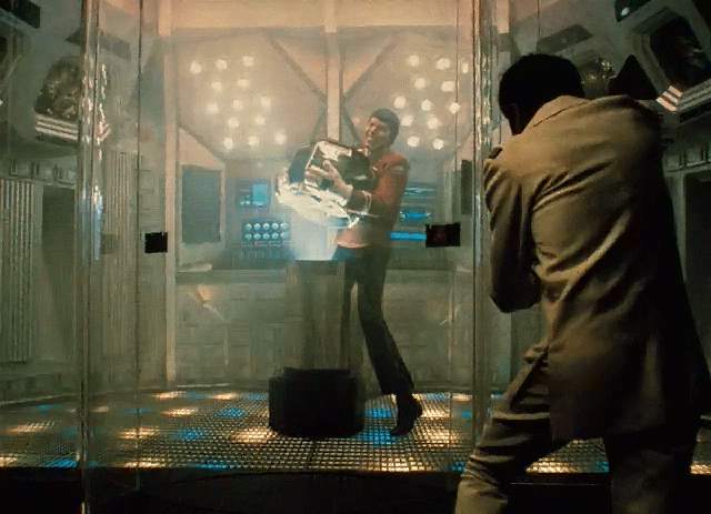 Spock desperately tries to repair the power mains as radiation destroys his body